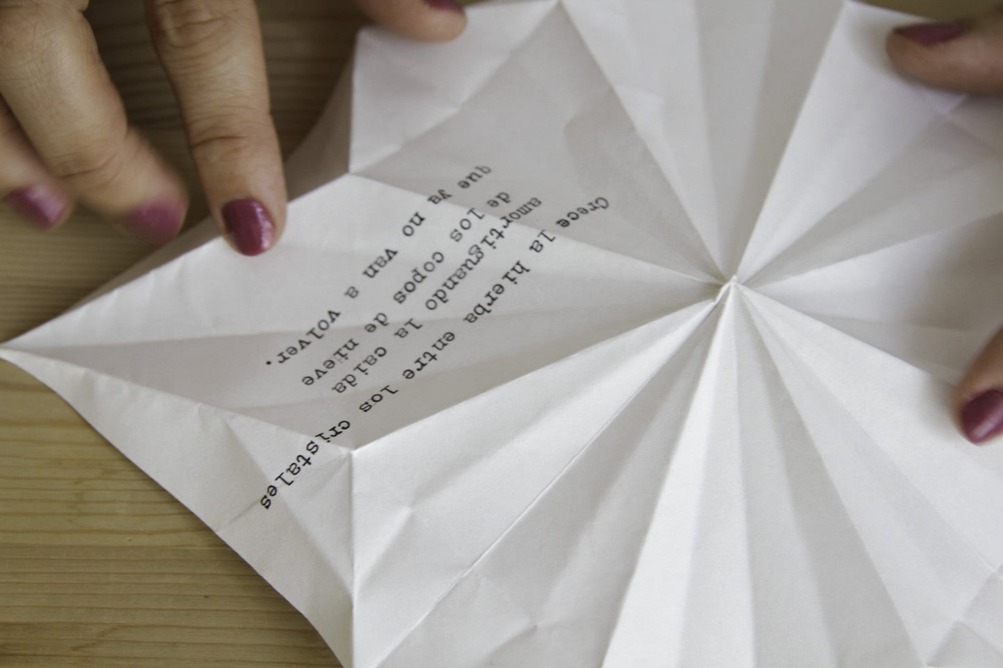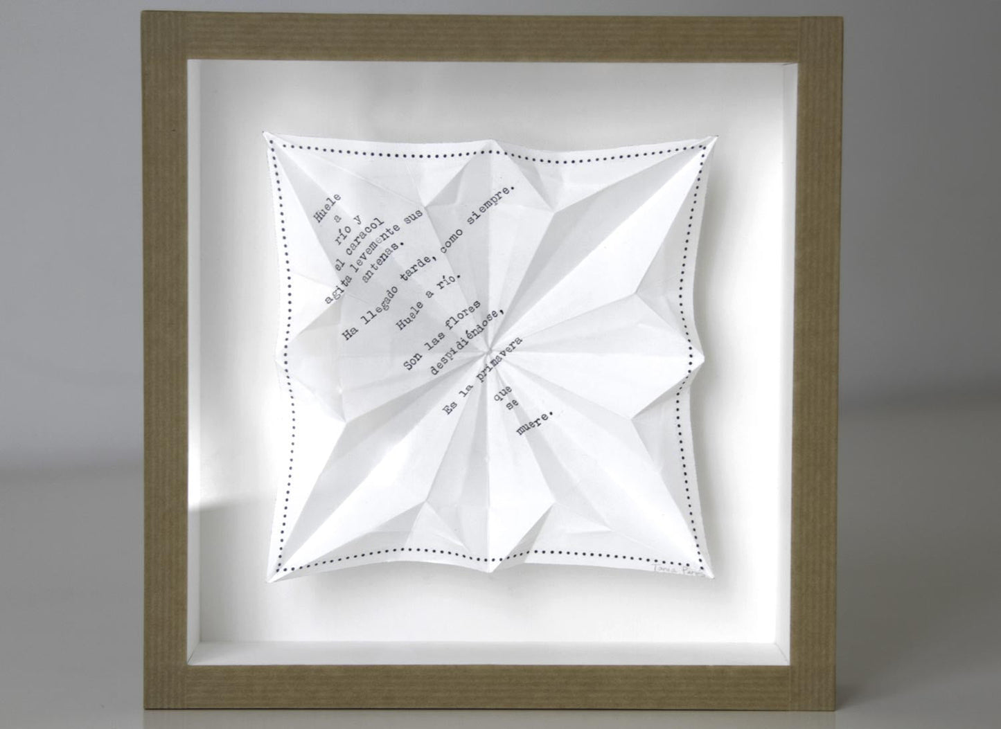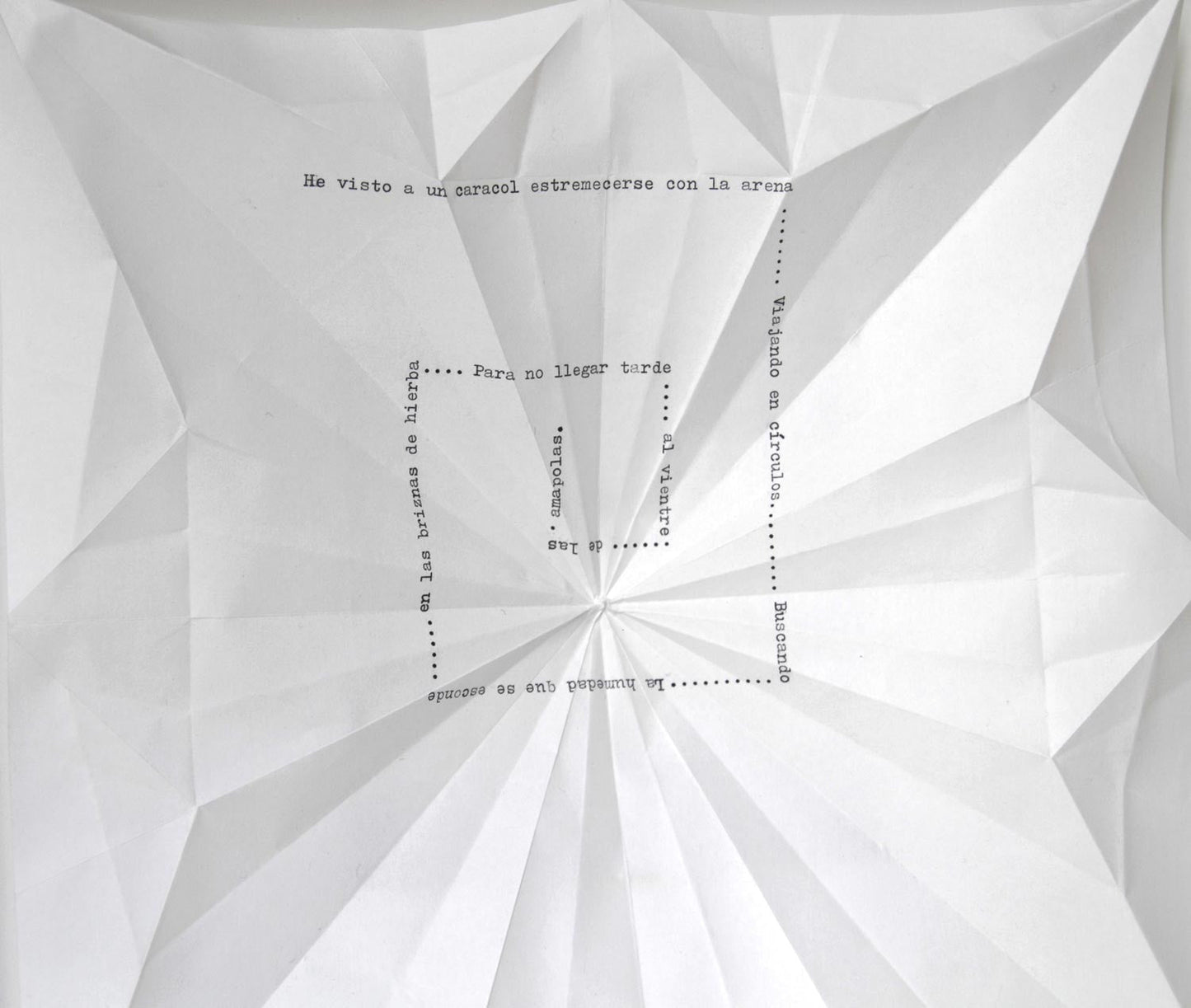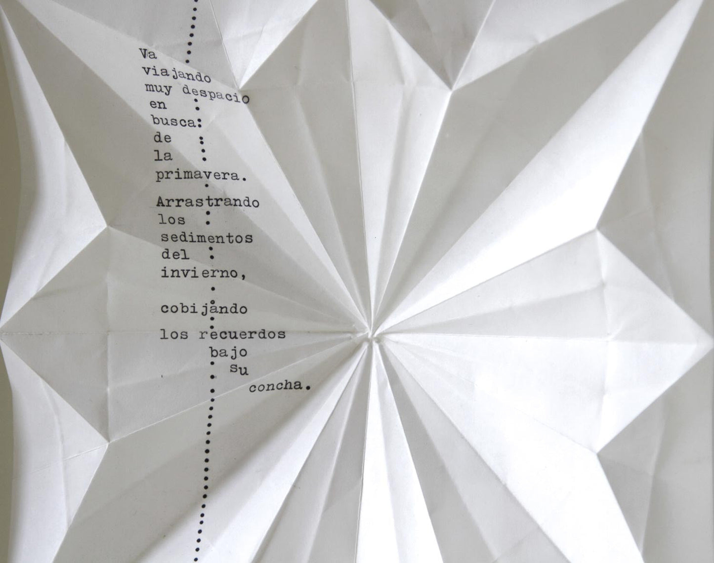 Serie de tres lirios realizados y deconstruidos por Virginia en papel de origami. Los versos compuestos por Tania describen el recorrido de un caracol durante la primavera. Tania escribe una bellísima historia sobre el papel. Pero, además, la máquina se convierte en un improvisado pincel que traza el camino que el caracol quiere seguir. El resultado lo podéis ver a continuación. El texto debe leerse del origami mayor al menor.