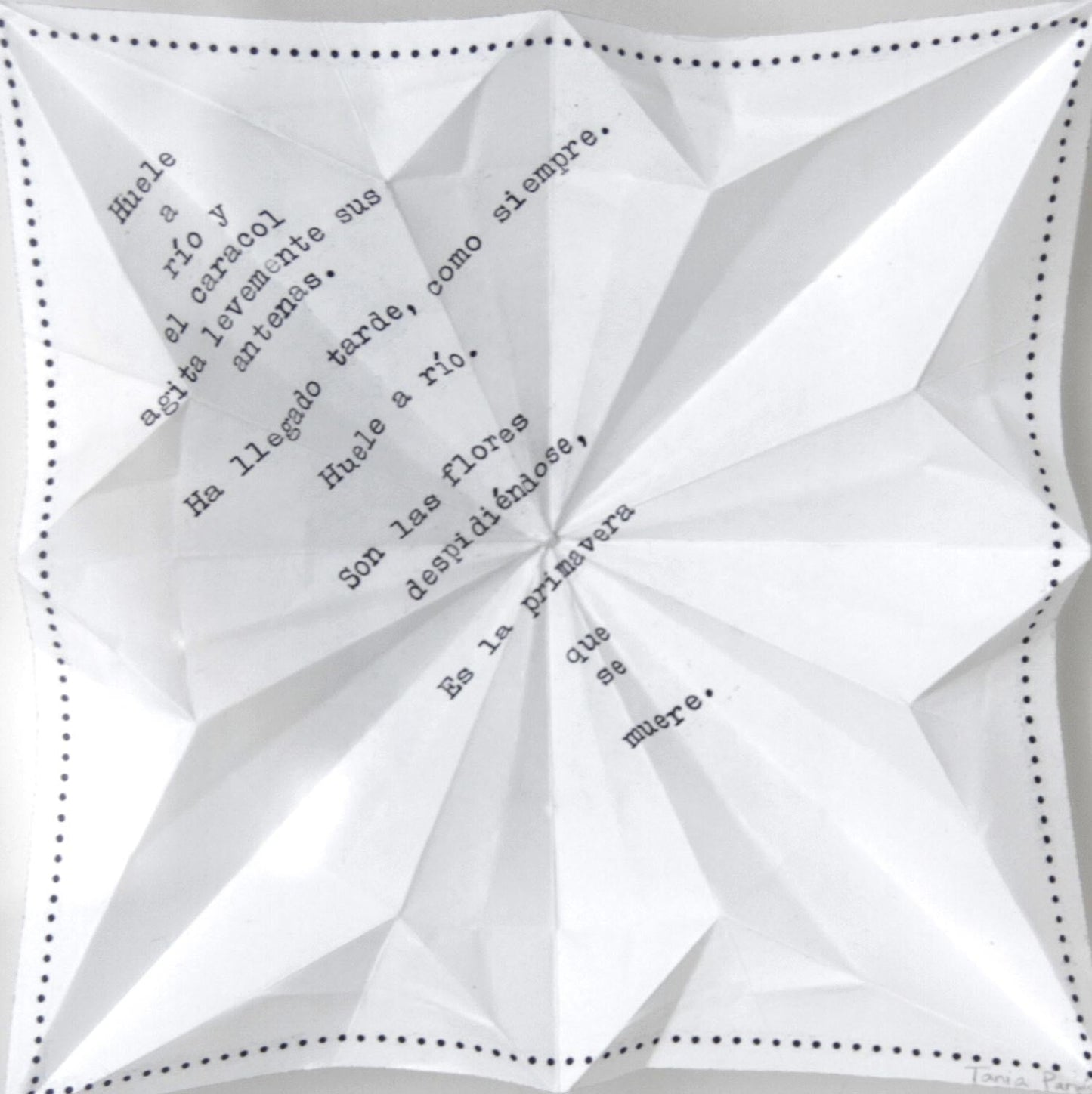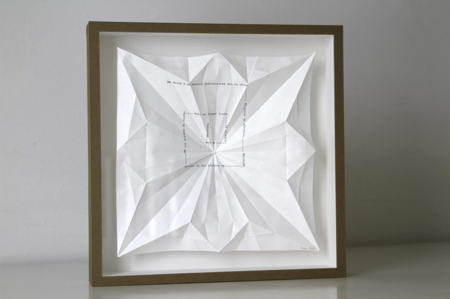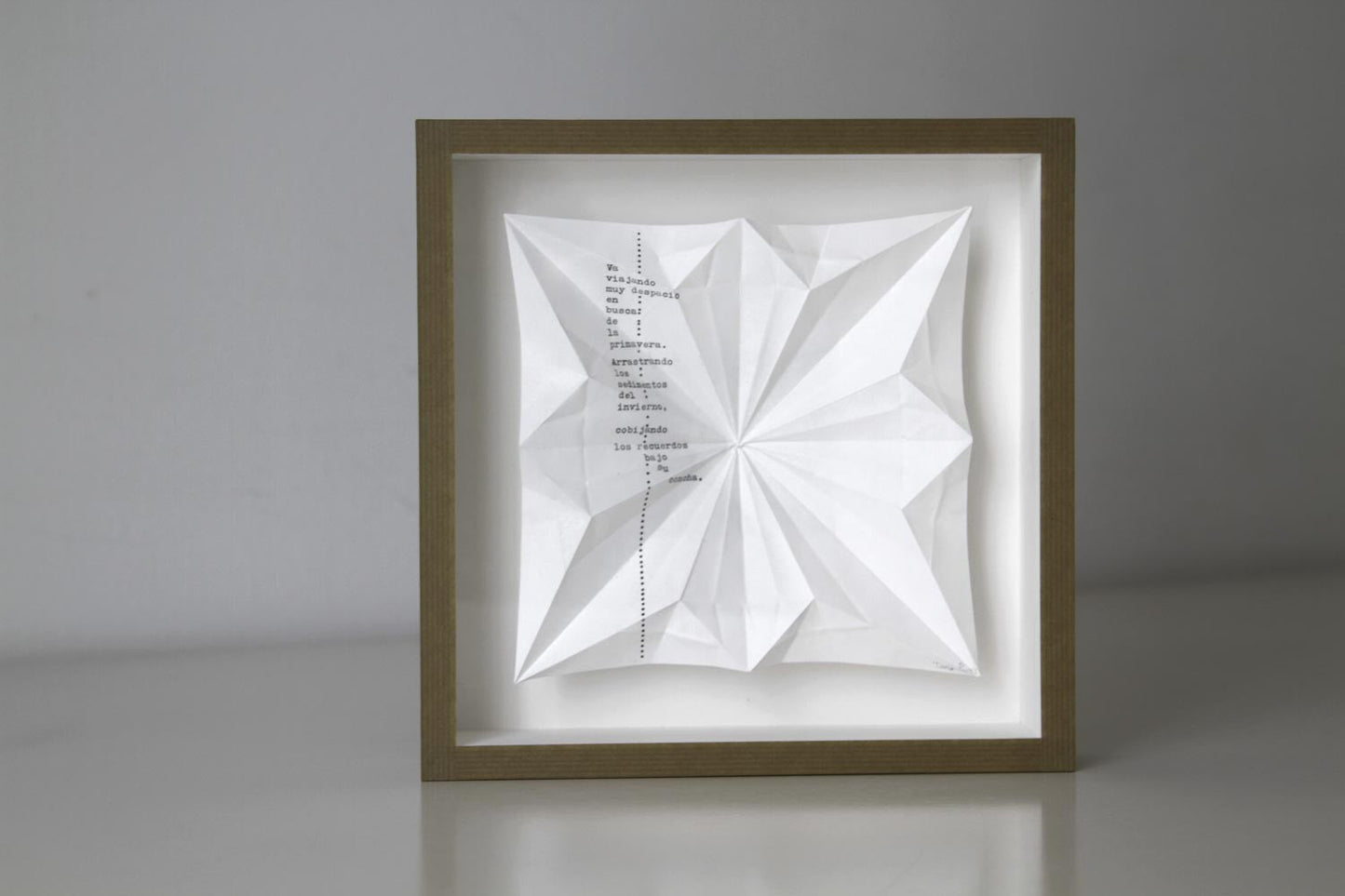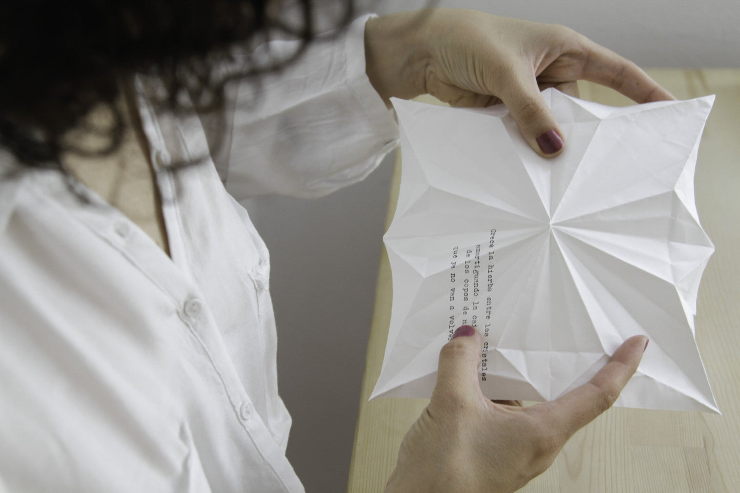 Serie de tres lirios realizados y deconstruidos por Virginia en papel de origami. Los versos compuestos por Tania describen el recorrido de un caracol durante la primavera. Tania escribe una bellísima historia sobre el papel. Pero, además, la máquina se convierte en un improvisado pincel que traza el camino que el caracol quiere seguir. El resultado lo podéis ver a continuación. El texto debe leerse del origami mayor al menor.