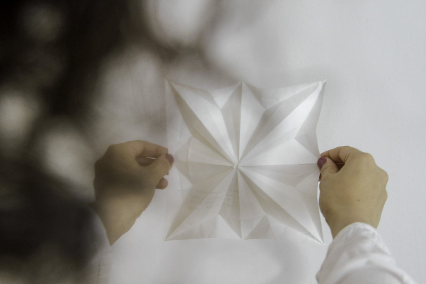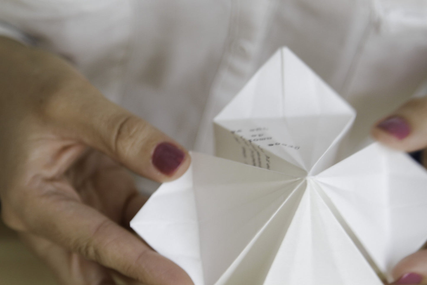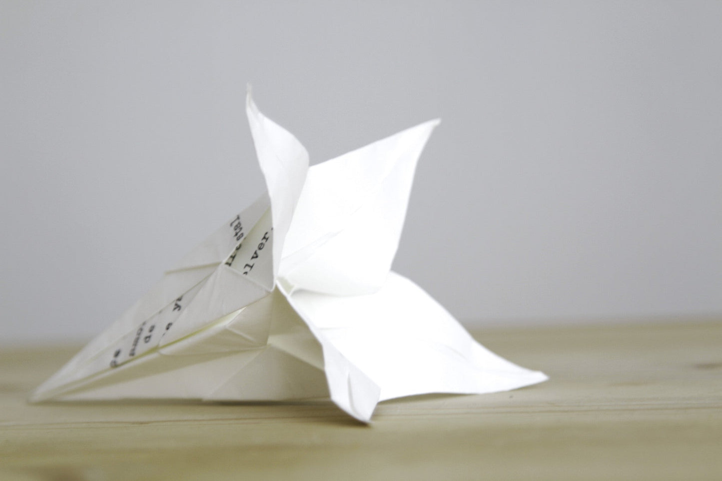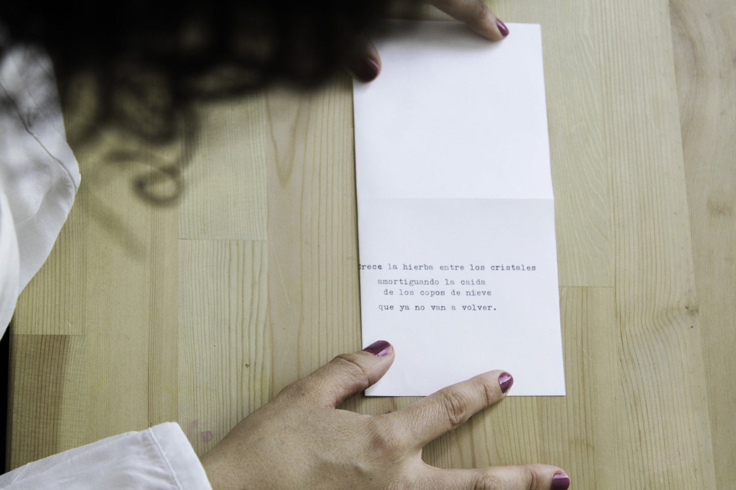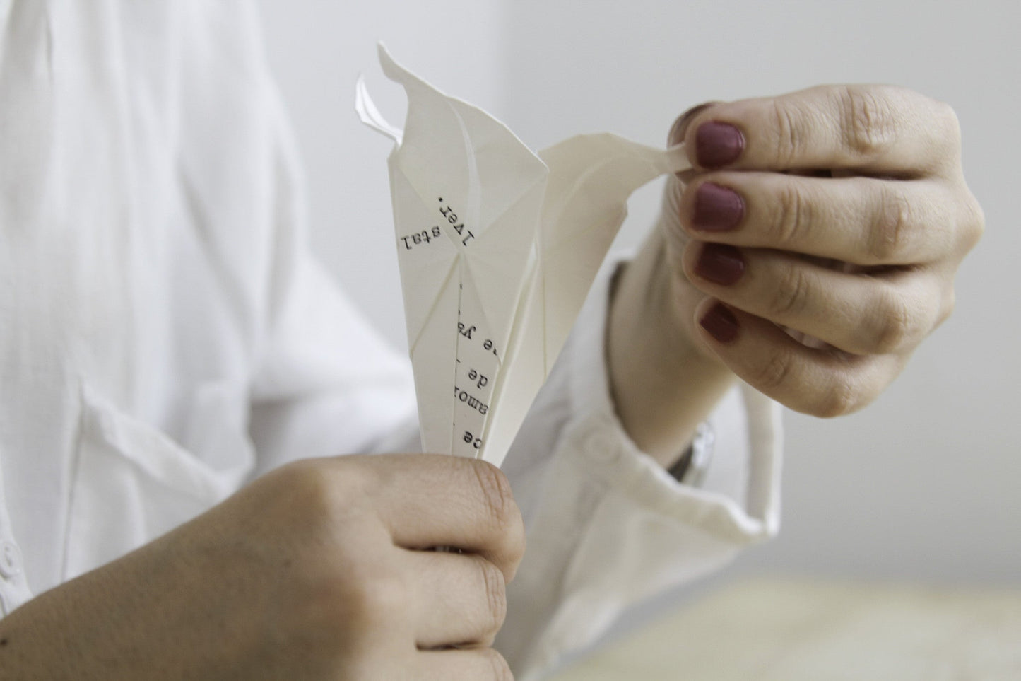 Serie de tres lirios realizados y deconstruidos por Virginia en papel de origami. Los versos compuestos por Tania describen el recorrido de un caracol durante la primavera. Tania escribe una bellísima historia sobre el papel. Pero, además, la máquina se convierte en un improvisado pincel que traza el camino que el caracol quiere seguir. El resultado lo podéis ver a continuación. El texto debe leerse del origami mayor al menor.