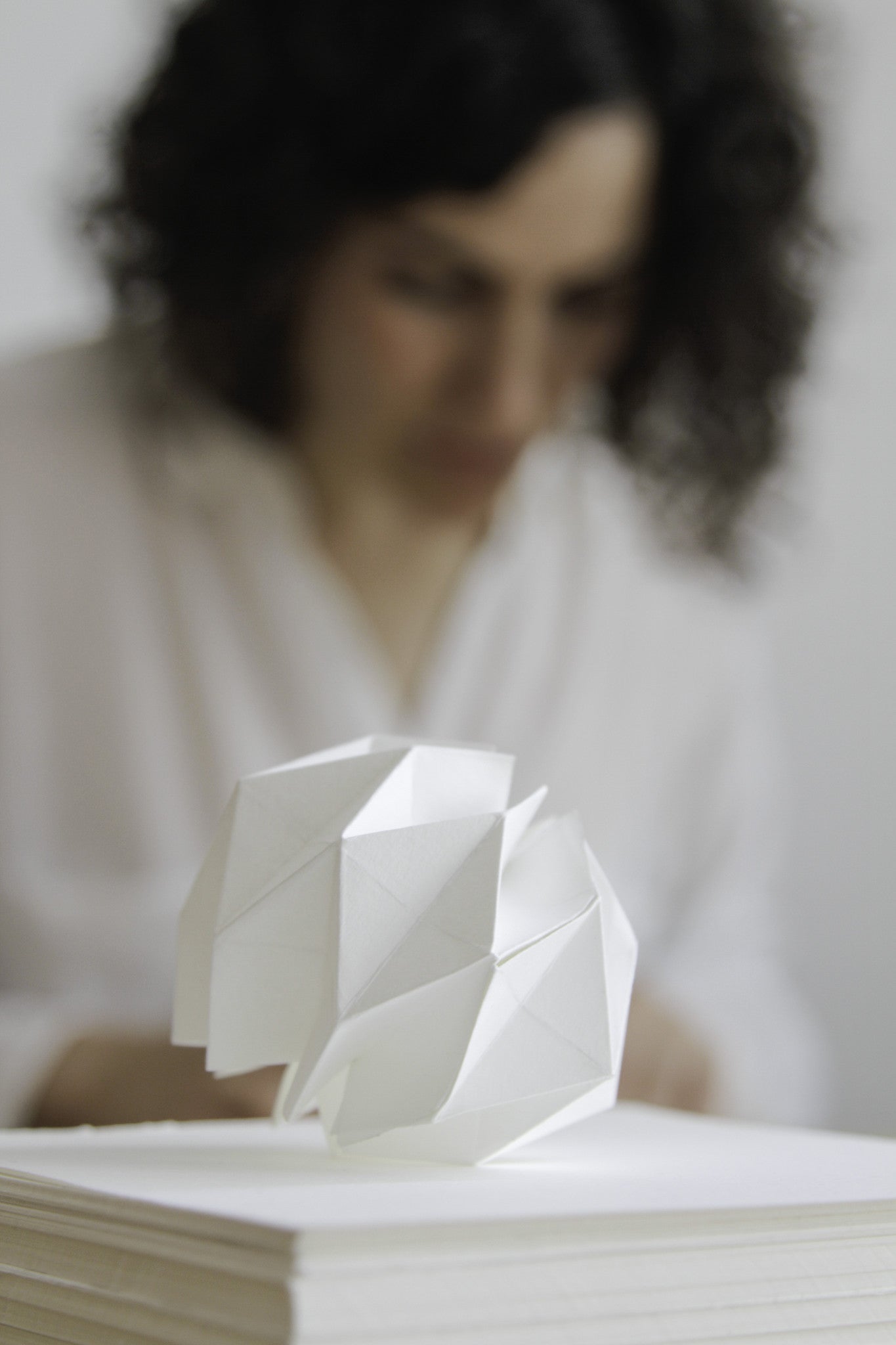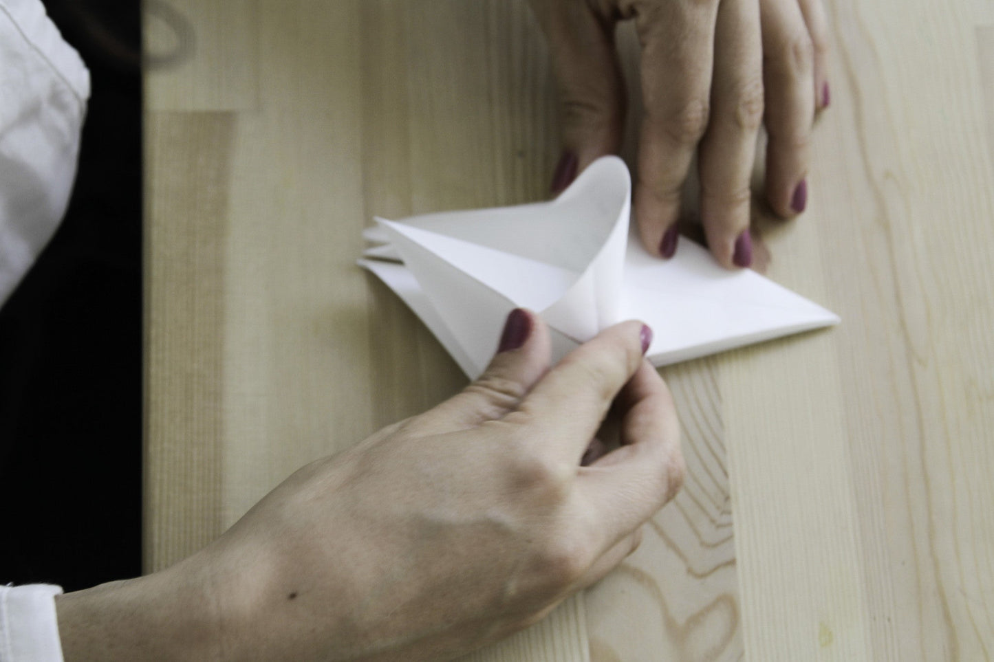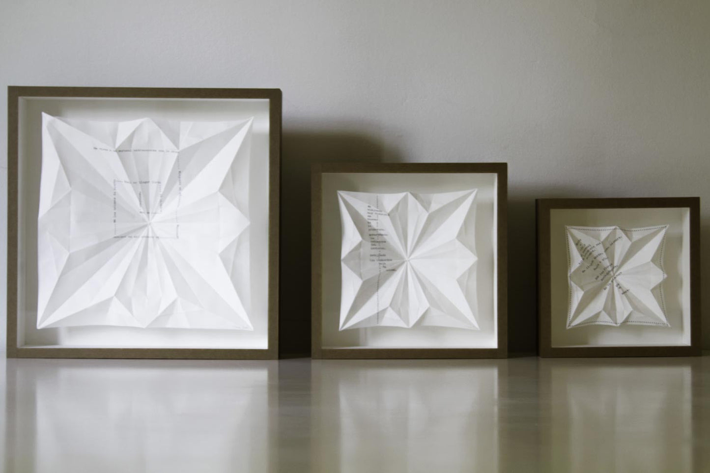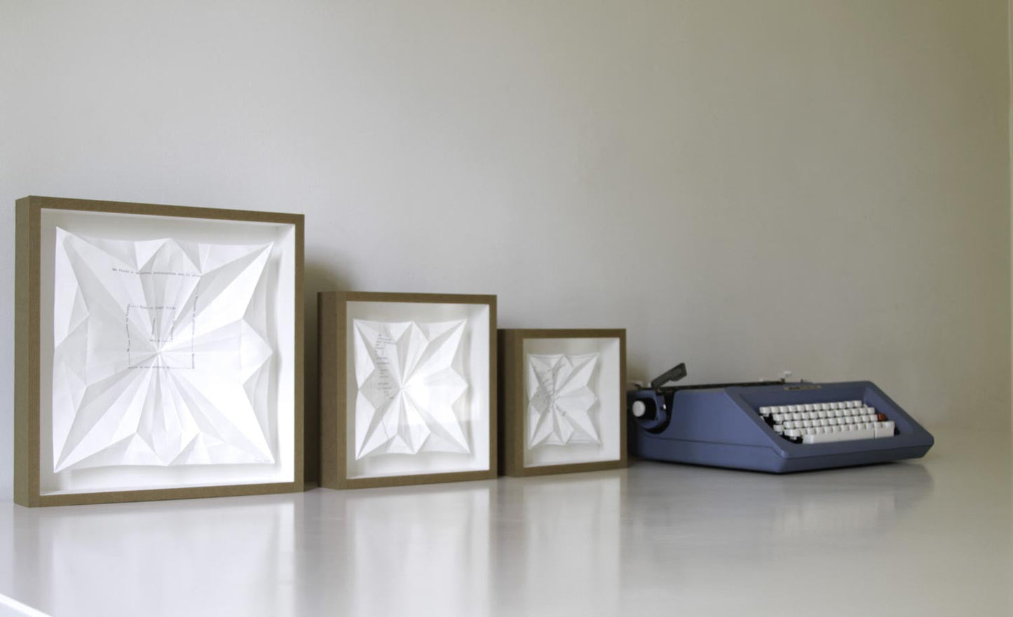 Serie de tres lirios realizados y deconstruidos por Virginia en papel de origami. Los versos compuestos por Tania describen el recorrido de un caracol durante la primavera. Tania escribe una bellísima historia sobre el papel. Pero, además, la máquina se convierte en un improvisado pincel que traza el camino que el caracol quiere seguir. El resultado lo podéis ver a continuación. El texto debe leerse del origami mayor al menor.