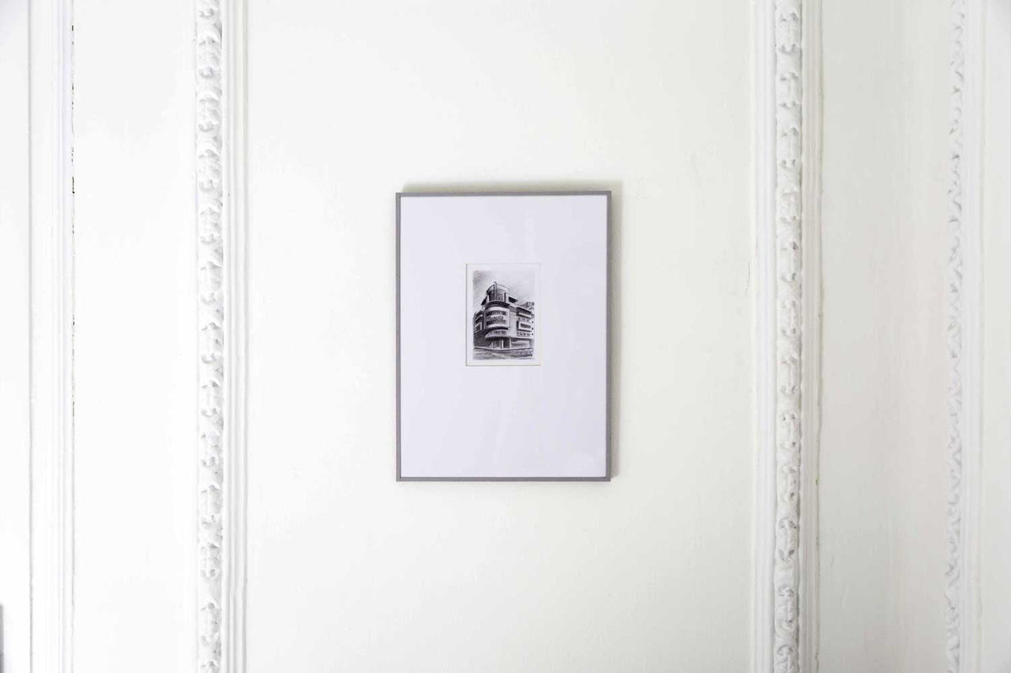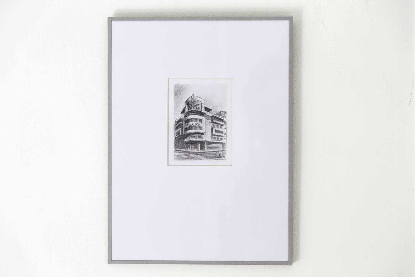 La interpretación a carboncillo de este edificio por parte de Carmelo no podía ser de otra forma. Su frontal achaflanado con el letrero "Barceló" es uno de los más reconocibles de la ciudad.