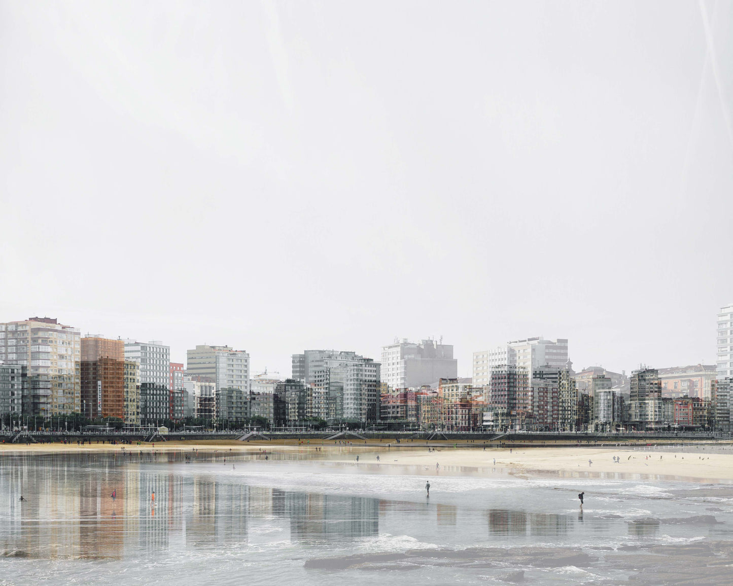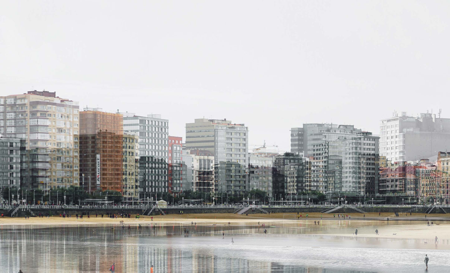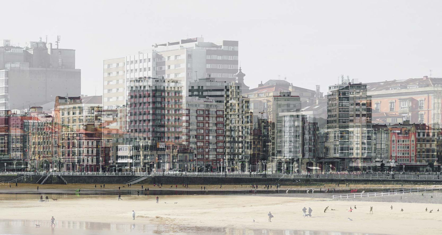 Inconfundible imagen de la playa de San Lorenzo que lo tiene todo de ella y lo tiene todo de Lizuáin: superposiones fotográficas, efecto pictórico, ambientes vaporosos....